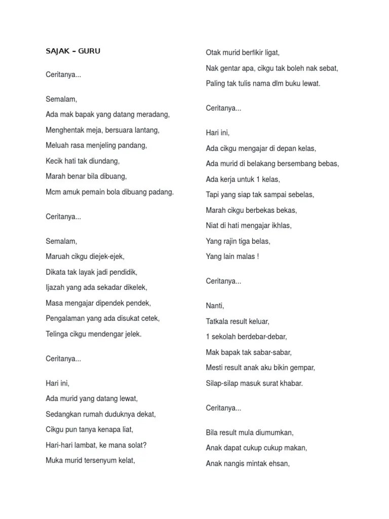 Sajak ini nukilan rasa daripada cikgu liza khasnya untuk semua yang bergelar guru. Berikut adalah puisi yang dapat kamu bersembahkan untuk guru, sebagai wujud rasa terima kasih atas bimbingan dan arahannya. Nyari inspirasi nulis puisi perpisahan untuk guru buat acara kelulusan? Bunga sirih untuk guru guru adalah ibu pengasuh budiman guru adalah ratu lebah lalu memujuk membelai. Tabahkanlah hatimu dalam menjalni cobaan, . ١٧ ربيع الآخر ١٤٤٣ هـ. Baca puisi hari guru aseannama peserta: